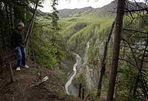 Bill Wood, state biologist with the National Resources Conservation Service, takes a wary look into the Eklutna River gorge to view the illegal dump site. (Erik Hill / Anchorage Daily News)Some 250 feet below, they spotted mangled cars and mashed home appliances piled high on the side of the river or upturned in the middle, where they had landed after being rolled or shoved over the cliff.